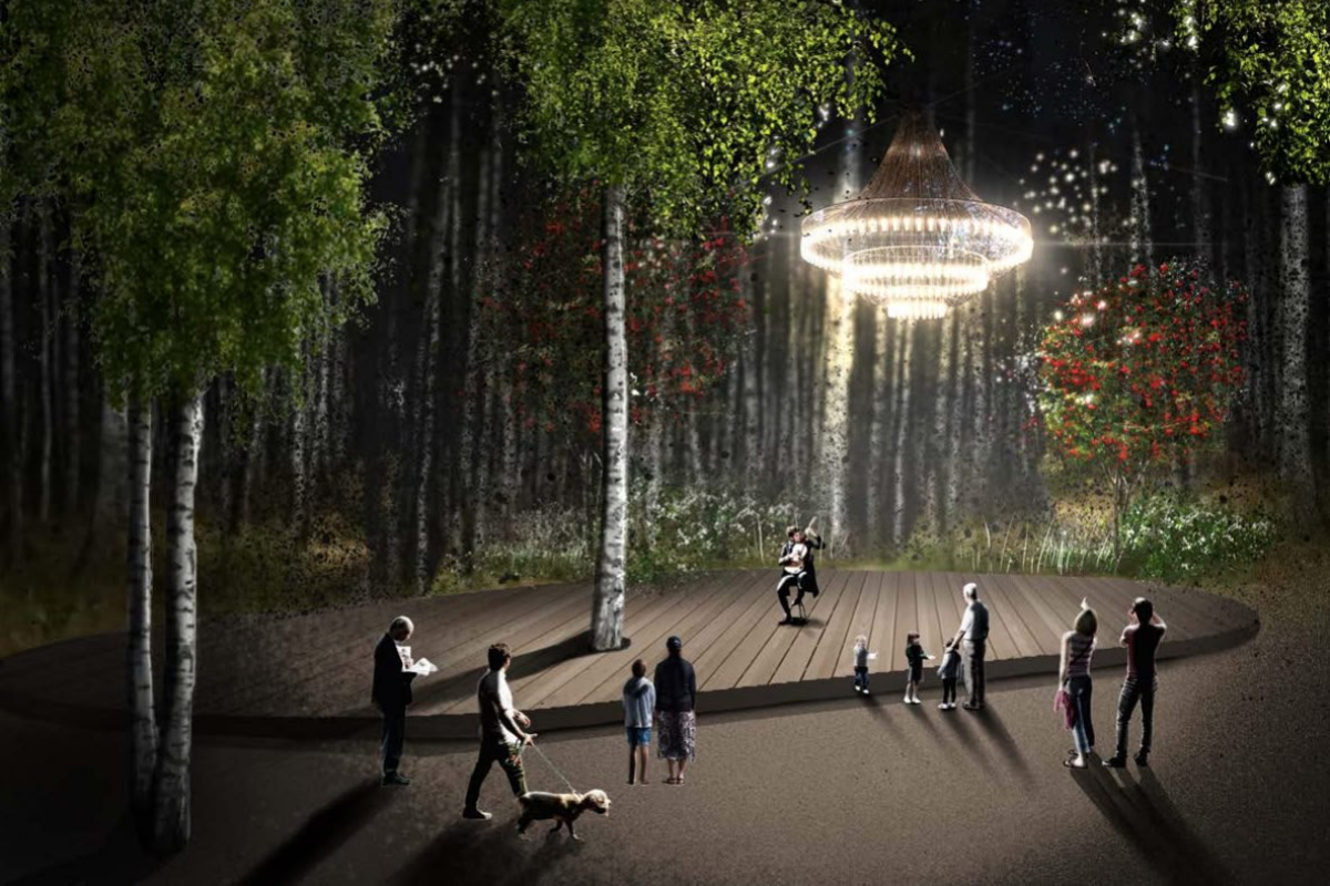 Кроме того, вдоль дорожек установят светильники, а самым ярким из них станет арт-объект «Люстра» в пространстве для массовых мероприятий. В дополнение на территории появятся лавки, качели, урны, шахматный стол.