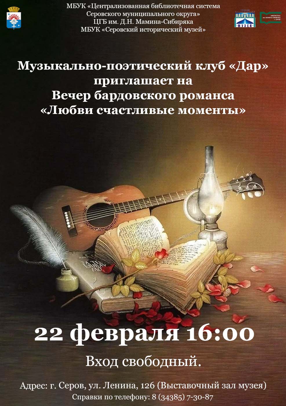 Любовь – река бурная. Между праздником мужчин и праздником женщин – как мостик меж двух берегов этой реки - вечер бардовского романса «Любви счастливые моменты». Мужчины – о женщинах, женщины – о мужчинах: говорят, сочиняют стихи, поют песни, вздыхают… или смеются. Да пусть их! Всё хорошо, кроме равнодушия. Разве равнодушные могут написать такие романсы? А вы их обязательно услышите, если придете на нашу встречу в Выставочном зале музея (Ленина, 126). Ждем вас.