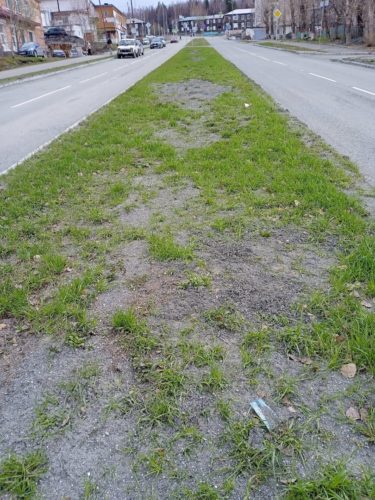 И ещё, раз уж про газоны речь ведем. Не так давно отремонтировали улицу Набережную. Сейчас эти тротуары (особенно который ближе к зеленой зоне) очень востребованы качканарцами. Там ходят любители скандинавской ходьбы, гуляют с колясками, бегают любители ЗОЖ, да и просто гуляют горожане. Во время ремонта дороги разделительная полоса между дорогой и тротуаром была выделена бордюрным камнем как газон (смотри фото 2). И администрация обещала эти газоны озеленить, посадить различные кусты. Обещанного, как водится, три года ждут, и в прошлом году там росли только репейник и лебеда. Сейчас эти газоны выглядят как собратья газонов по Дружинников.